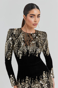 Feel a million dollars when dressed in the KYRA Black Dress, a luxurious rich velvet design. This statement velvet mini dress features a round neckline, shoulder pads, internal corset boning for shape and support, and is adorned with exclusively designed degraded gold-tone sequins that shimmer with every movement. This piece is finished with a concealed zip to the back for a sleek finish. - Exclusive black velvet - Exclusively designed degraded gold-tone sequin - Intricate gold-tone bead and sequin embellished detailing - Round neckline - Shoulder pads - Internal corset boning to the bodice - Concealed zip to the back - Outer: 92% Polyester 8% Elastane Lining: 92% Polyester 8% Elastane Size & Fit Information - Item runs to our size chart. Please refer here for the best fit. - Figure-hugging fit - Stretch Factor: Stretch - Model is 175cm/5'9" wearing 4" heels and a size S - Please note that if your style arrives longer than you desired it can be easily taken up by a local tailor.