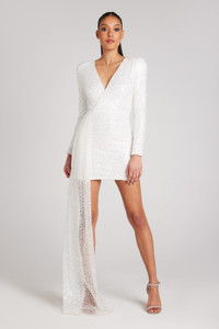 The LEAH White Sequin Mini Dress is worn to be seen. Whether you’re looking for a bridal outfit or a memorable engagement party look, this white dress is guaranteed to steal the scene. With structured shoulders and a floor-sweeping drape, this hand-embellished mini dress is made to fit and flatter your body shape. Feel confident and glamorous with MERABI’S LEAH White Sequin Mini Dress. Size & Fit Information - Item runs to our size chart . Please refer here for the best fit. - Model is 176cm/ 5ft 8 wearing 4” heels and size S. - Please note that if the drape arrives longer than you desired, it can be easily taken up by a local tailor. - The length of the dress is only 87cm based on an XS. - Stretch Factor: No Stretch.