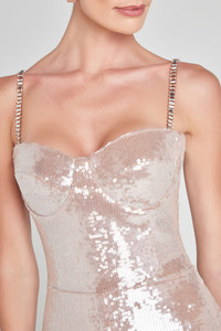 Steal the spotlight in LUCINDA. A figure-holding jumpsuit complete with our signature flared trouser. Crafted from our exclusively designed champagne sequin fabrication that mesmerises on every occasion. LUCINDA flares from the knee for a figure balancing silhouette, complete with an underwired corset bodice to give structure and provide shape. It's internally boned at the front, back and sides for the most comfortable cinching ever. Complete with removable jewelled straps for adaptable elegance and a concealed zip closure for a smooth fit. - Fitted jumpsuit with flared trousers - Designed from our exclusive sequin fabrication - Corset bodice - Internal boning to the front, back and sides - Underwired bra top - Fully lined for a smooth fit - Concealed zip closure for a smooth fit - Adjustable, detachable jewelled straps - Outer: 86% Polyester 14% Elastane, Lining: 85% Polyester 15% Elastane Size & Fit Information SIZE & FIT INFORMATION - Item runs to our size chart. Please refer here for the best fit. - Model is 174cm / 5ft 7” wearing 5.5” heels and size XS - We recommend if you are 5ft 8" or above to select the size up - Stretch Factor: Minimal Stretch - Body length from top edge centre front to waist seam is 20.5cm based on size XS, inside leg is 90cm on all sizes inside leg 90cm