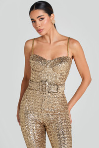 Have a MERABI moment in the Lucinda Gold Jumpsuit. Crafted from our exclusively designed sequin for a lustrous look, this gold sequin jumpsuit is made to elevate your special events. The underwire bustier and flared trousers give structure and compliment your shape; it’s boned to the front, back, and sides to create an ultra-flattering silhouette. The removable gold-look chain straps and detachable belt add a to - Signature flared pants - The MERABI signature flared leg elongates your frame for a bold, flattering look. - Underwired bustier - The structured bodice is boned in the front, back, and sides to provide support and shape for a sculptured, feminine silhouette. - Removable gold-look chain straps - A versatile detail allowing you to customize your look; wear with or without for different styling options. Size & Fit Information - Item runs to our size chart. Please refer here for the best fit. - Model is 174cm / 5ft 7” wearing 5.5” heels and size XS - Body length from top edge centre front to waist seam is 20.5cm based on size XS, inside leg is 90cm on all sizes inside leg 90cm - We recommend if you are 5 ft8" or above to select the size up - Stretch Factor: Minimal Stretch - Please note that if the jumpsuit arrives longer than you desired it can be easily taken up by a local tailor.