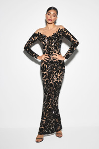 The MELISSA Black Dress is crafted from sheer nude mesh, intricately adorned with leaf sequin embellishments. Each placement is thoughtfully designed to create the perfect balance of coverage and allure. Featuring an off-the-shoulder neckline, full-length sleeves, and a sculpted maxi silhouette, this piece is finished with a concealed zip closure at the back for a smooth fit. Please note: This style is sheer with overlayed sequins and does not include a slip. To be styled with tonal underwear. - Sheer nude mesh fabrication - Off-the-shoulder neckline - Full-length sleeves - Sculpted maxi silhouette - All-over sequin leaf embellishments - Concealed zip closure at back for a smooth fit - Tonal underwear required Size & Fit Information - Item runs to our size chart. Please refer here for the best fit. - Model is 175cm / 5'9" wearing 4" heels and is wearing a size XS - Stretch Factor: No Stretch