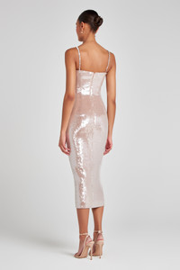 When the lights go out, shine on in NINA Champagne Midi Dress. Crafted from an exclusive spotlight-demanding champagne sequin stretch fabric, this dress exudes opulence on every occasion. NINA features a fully boned corset and bodycon midi design for that perfect silhouette. It's underwired cups and sweetheart neckline keep you in place all-day-long, while adjustable jewelled straps ensure adaptable elegance. While the concealed zip closure to the centre back ensures a smooth fit. We recommend sizing up for a more comfortable fit. - Fitted figure-flattering bodycon midi dress - Corset bodice - Internal boning to the front, back and sides - Underwire bra cup - Fully lined for a smooth fit - Concealed zip closure for a smooth silhouette - Adjustable, detachable jewelled straps - Outer: 86% Polyester 14% Elastane, Lining: 96% Polyester 4% Elastane Size & Fit Information - Item runs to our size chart. Please refer here for the best fit. - Model is 5'9" wearing 4" heels and a size XS - Total length from front top edge (centre) is 102cm based on a size XS - Stretch Factor: Minimal Stretch