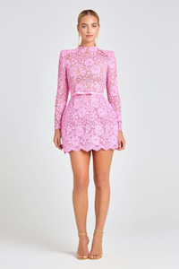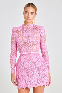 Embody timeless elegance with the SOPHIE pink mini dress. Crafted from sheer lace that showcases a subtle hint of skin, the SOPHIE dress features our signature structured tulip silhouette, and high round neckline. Long sleeves with a scalloped hem add refined detail, while padded shoulders offer a touch of sophistication. Style it with or without the detachable high-shine bow belt. SOPHIE comes with a separate nude slip for optional coverage, complete with a concealed zip closure – available in light or dark nude. We recommend sizing up for a more comfortable fit. - Mini dress - Sheer corded lace fabrication - High round neckline - Long sleeves with scalloped hem - Signature tulip skirt with scallop hem - Zip closure - Detachable high shine bow belt - Separate slip with adjustable straps and zip for additional coverage - Bodice Outer: 100% Polyester, Lining: 100% Nylon Size & Fit Information - Item runs to our size chart. Please refer here for the best fit - Model is 175cm/ 5'9 " and wearing 4" heels and size XS - Side neck point to hem 87cm - Stretch Factor: No Stretch