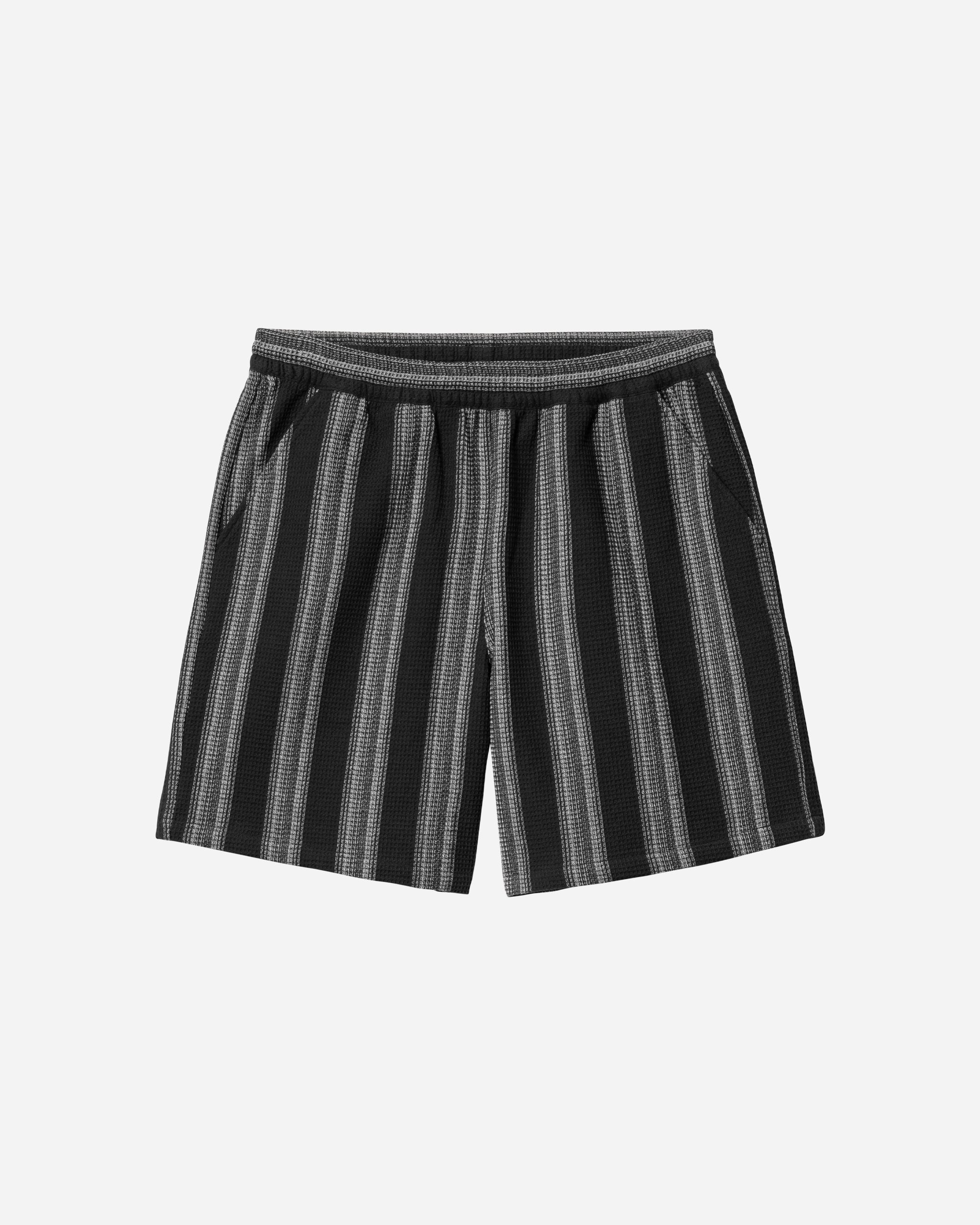 The Dodson Short is crafted from midweight, textured cotton waffle with an allover stripe pattern. It features an elasticated drawstring waistband for an adjustable fit, two slanted pockets, a back pocket, and a woven Square Label on the back pocket. Made from 100% cotton, it is yarn-dyed and garment-washed for added comfort. Details: 100% cotton Sizing: UNISEX Article Number: I033692-2A3XX Product color: Dodson Stripe, Black