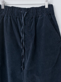 Album di Famiglia's signature Wide and Short Trousers in a lightweight, soft and stretchy cotton velvet. Details include an elasticated waist with drawstrings, side pockets, oversized lower back patch pockets, and wide, cropped legs. - Made in Italy - 97% Cotton, 3% Elastane - Available in Oatmeal (warm white), Marron Glace (grayish beige), Black, Ink (navy) - Model is 5'7/170cm and wears size S