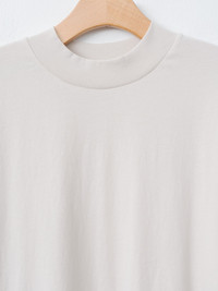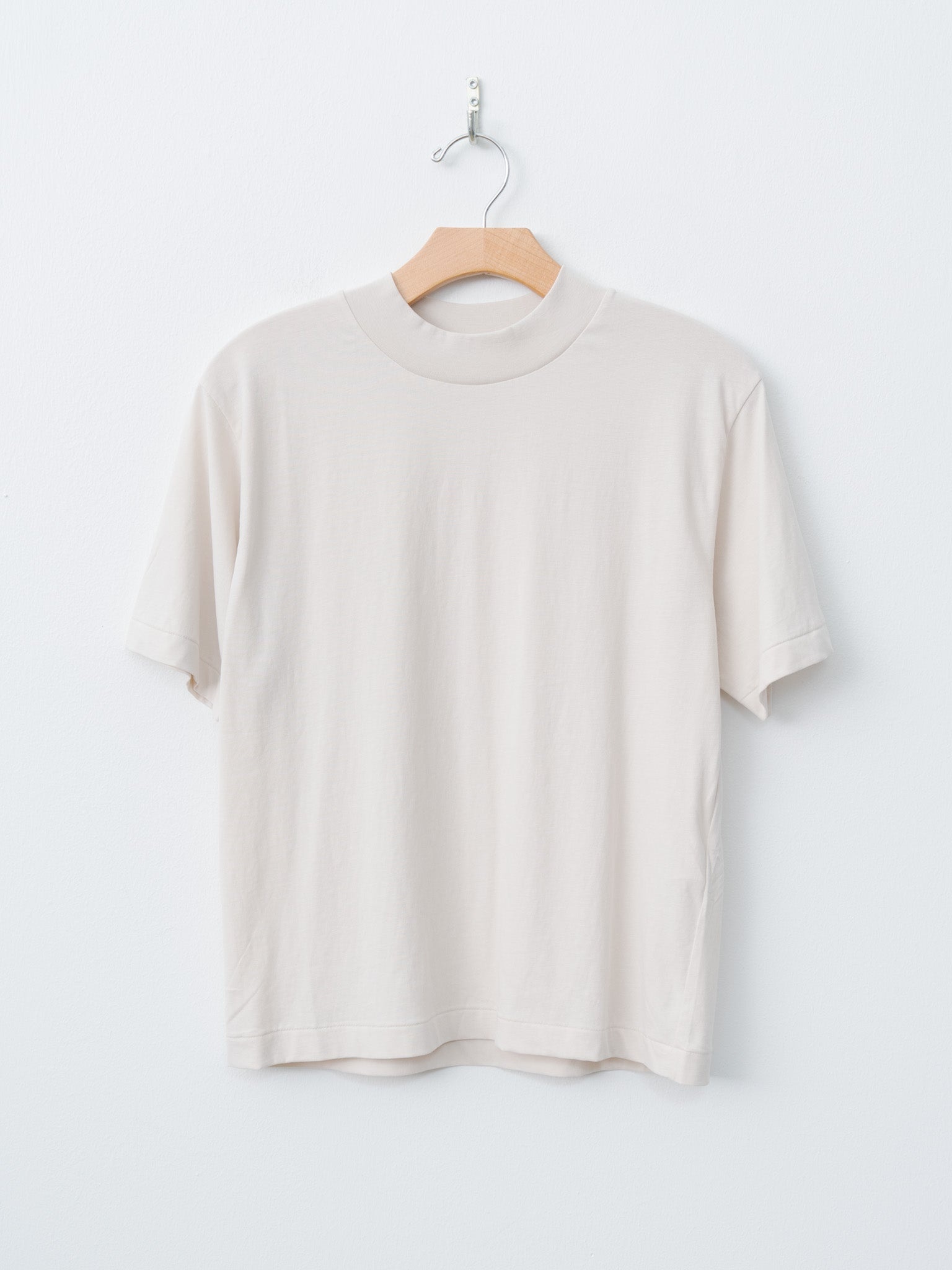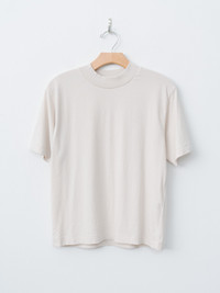 Made from hand-picked Suvin cotton and brushed twice for a suede-like softness, this cotton jersey tee offers a soft, velvety texture and matte finish. It features a classic mockneck, short sleeves, and a clean silhouette with minimal seams. The fabric has just enough structure to hold its shape while remaining breathable and comfortable. - Made in Japan - 100% Cotton - Available in Warm White - The model is 5'7"/170cm and wears size 2/M