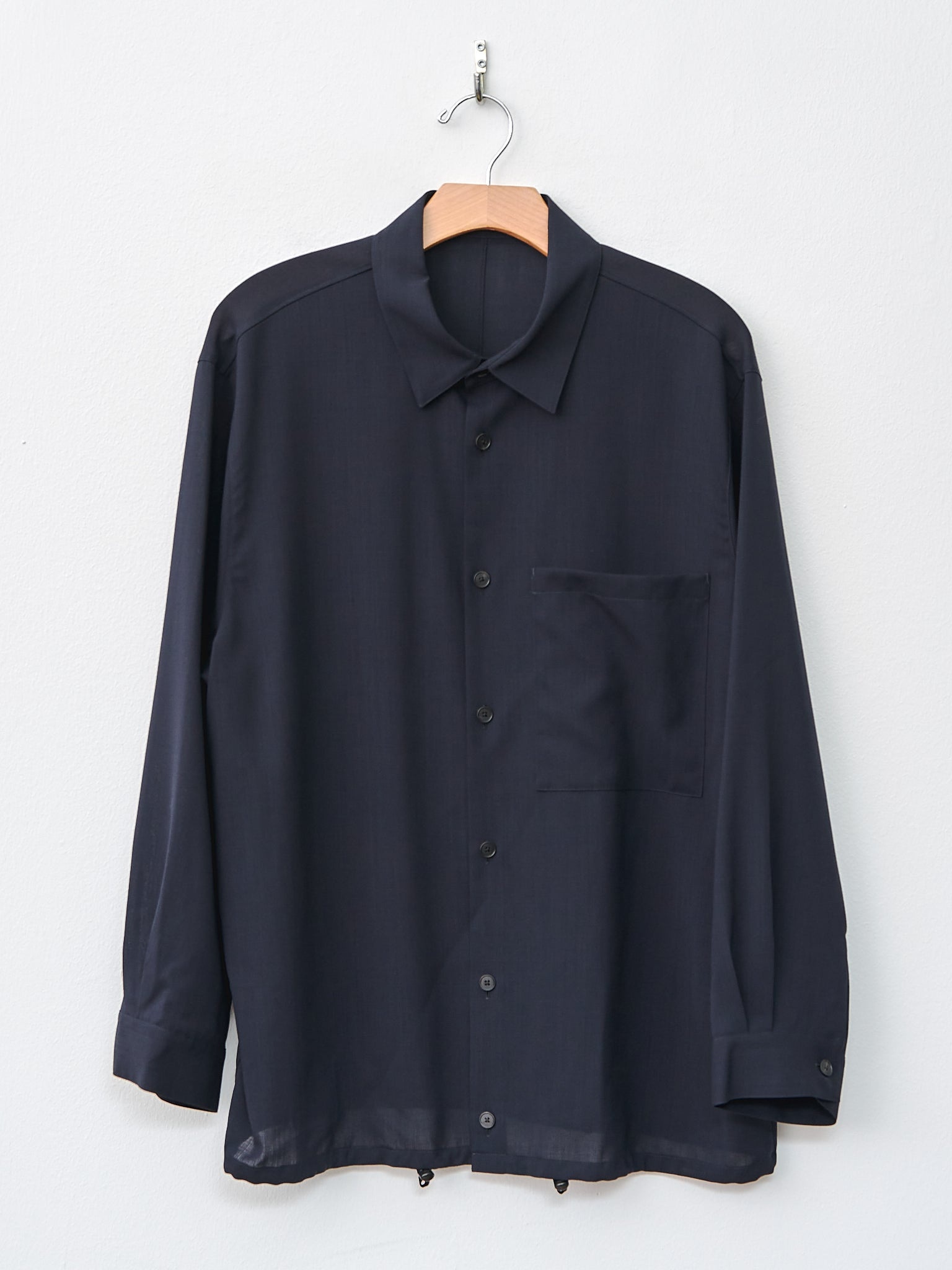 A lovely option for casual suiting: a shirt jacket from Aton in a fine wool gauze woven in Gifu prefecture of Japan. The use of wool yarns with an original twisting method results in a lightweight wool with a wonderful drape. It features a regular collar, buttoned front and cuffs and a drawstring hem that can adjusted to create a bubble hem and to wear as a shirt or jacket. Oversized fit. - 100% Wool - Made in Japan - Available in Navy - Our model is 5'7/170cm and wears size 2/One Size