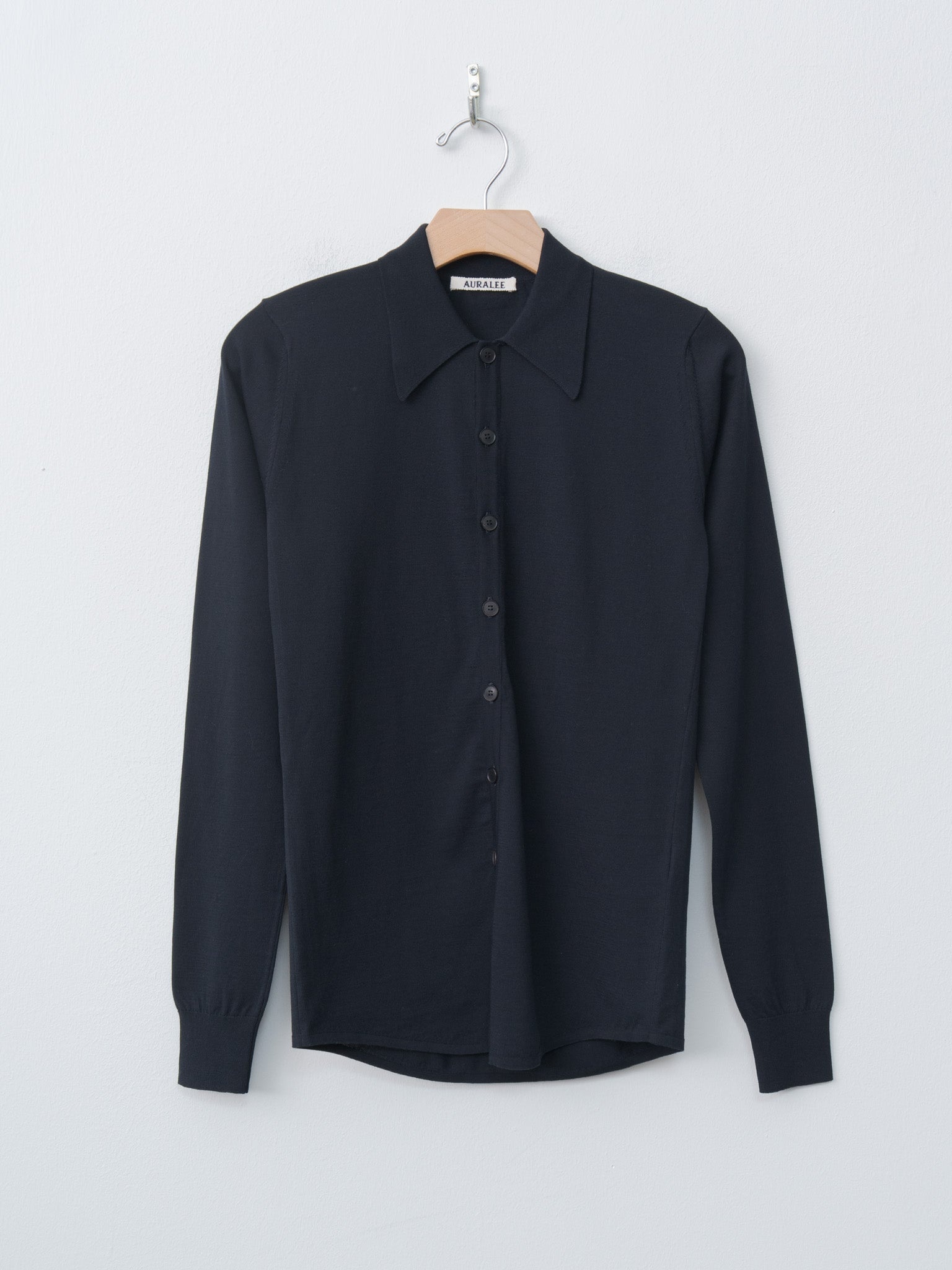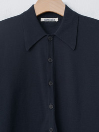 An elegant shirt-style knit cardigan made from a high gauge, strongly twisted cotton - it features a tightly knit structure with gentle stretch. Details include a buttoned front, curved hem, ribbed collar and cuffs and a close body fit that stretches to fit. - Made in Japan - 100% Cotton - Available in Dark Navy - The model is 5'7"/170cm and wears size 1/S