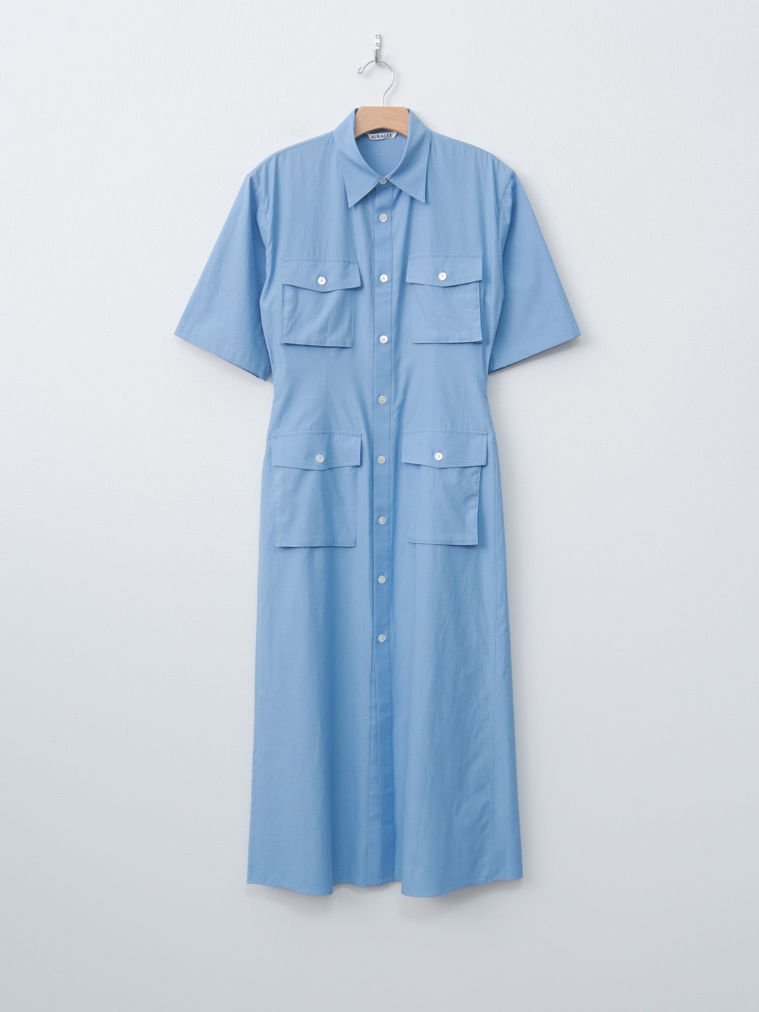 A utiliaritarian shirt dress from Auralee with a feminine touch. The high density Finx cotton was initially stiffened and then beat and washed repeatedly to achieve a soft texture - the result is a supple touch reminiscent of silk, an elegant sheen and beautiful drape. Details include a fully buttoned front, front patch pockets and darts along the waist for a flattering silhouette. - Made in Japan - 100% Cotton - Available in White, Blue - The model is 5'7"/170cm and wears size 1/S