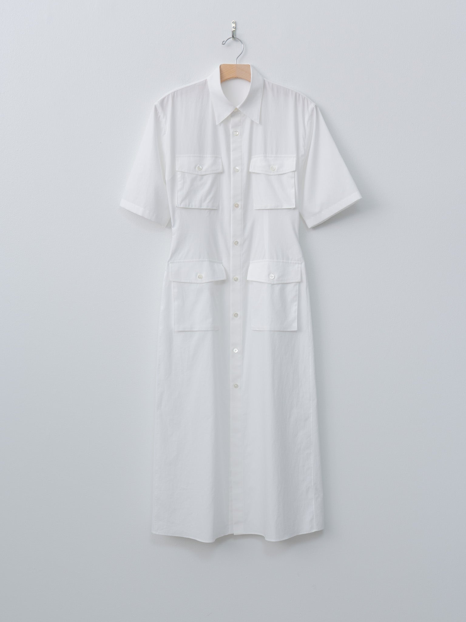 A utiliaritarian shirt dress from Auralee with a feminine touch. The high density Finx cotton was initially stiffened and then beat and washed repeatedly to achieve a soft texture - the result is a supple touch reminiscent of silk, an elegant sheen and beautiful drape. Details include a fully buttoned front, front patch pockets and darts along the waist for a flattering silhouette. - Made in Japan - 100% Cotton - Available in White, Blue - The model is 5'7"/170cm and wears size 1/S