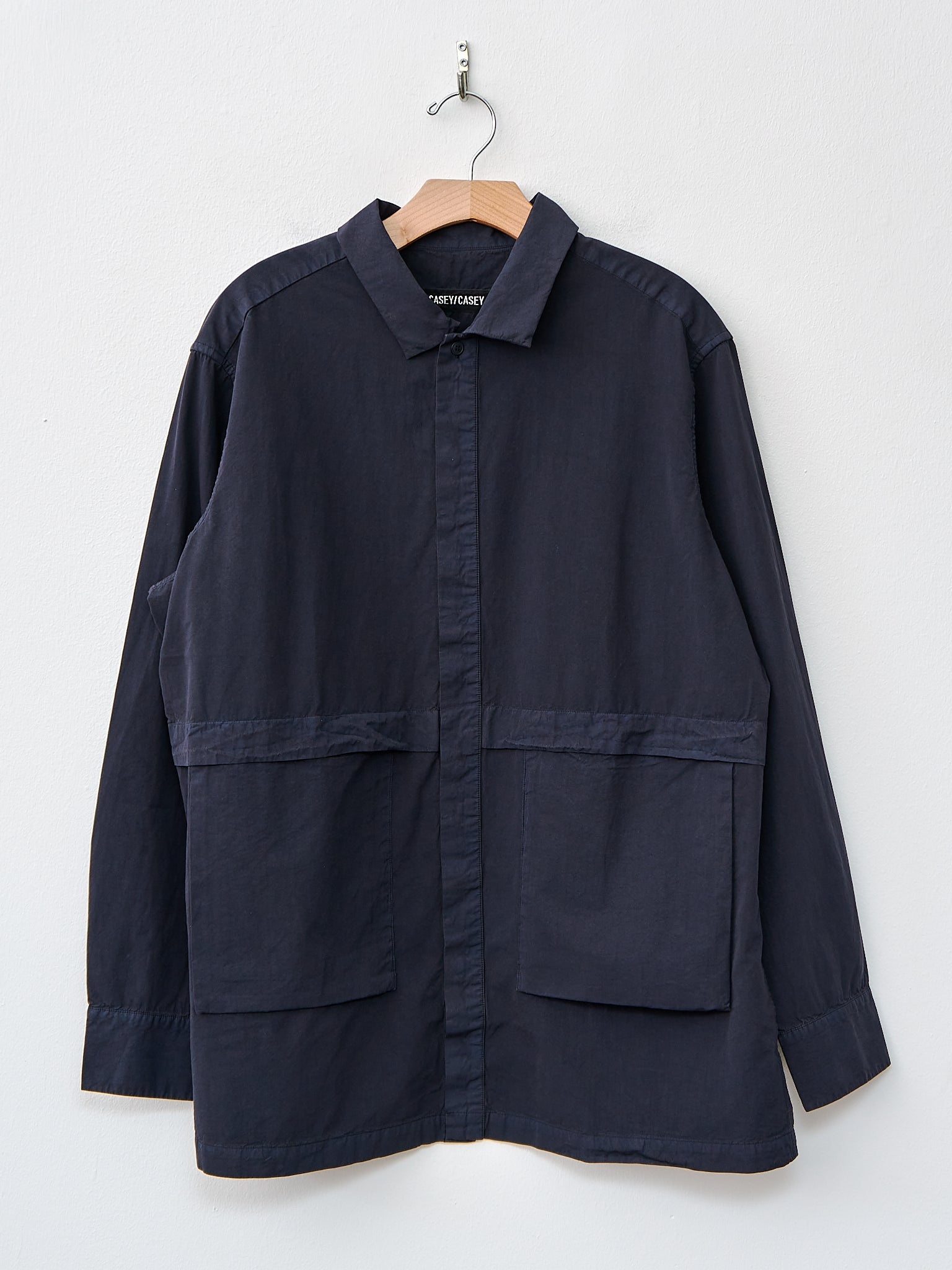 From Casey Casey a shirt jacket featuring patch pockets with flap and gusset on the front. The fabric is a Casey Casey classic 'paper cot', a regular weight compact cotton with a beautiful washed finish. Other details include a concealed button placket, buttoned cuffs and pleated back. Relaxed fit. - Made in Portugal - 100% Cotton - Available in Night (dark navy black) - Model is 6'1/180cm and wears a size M