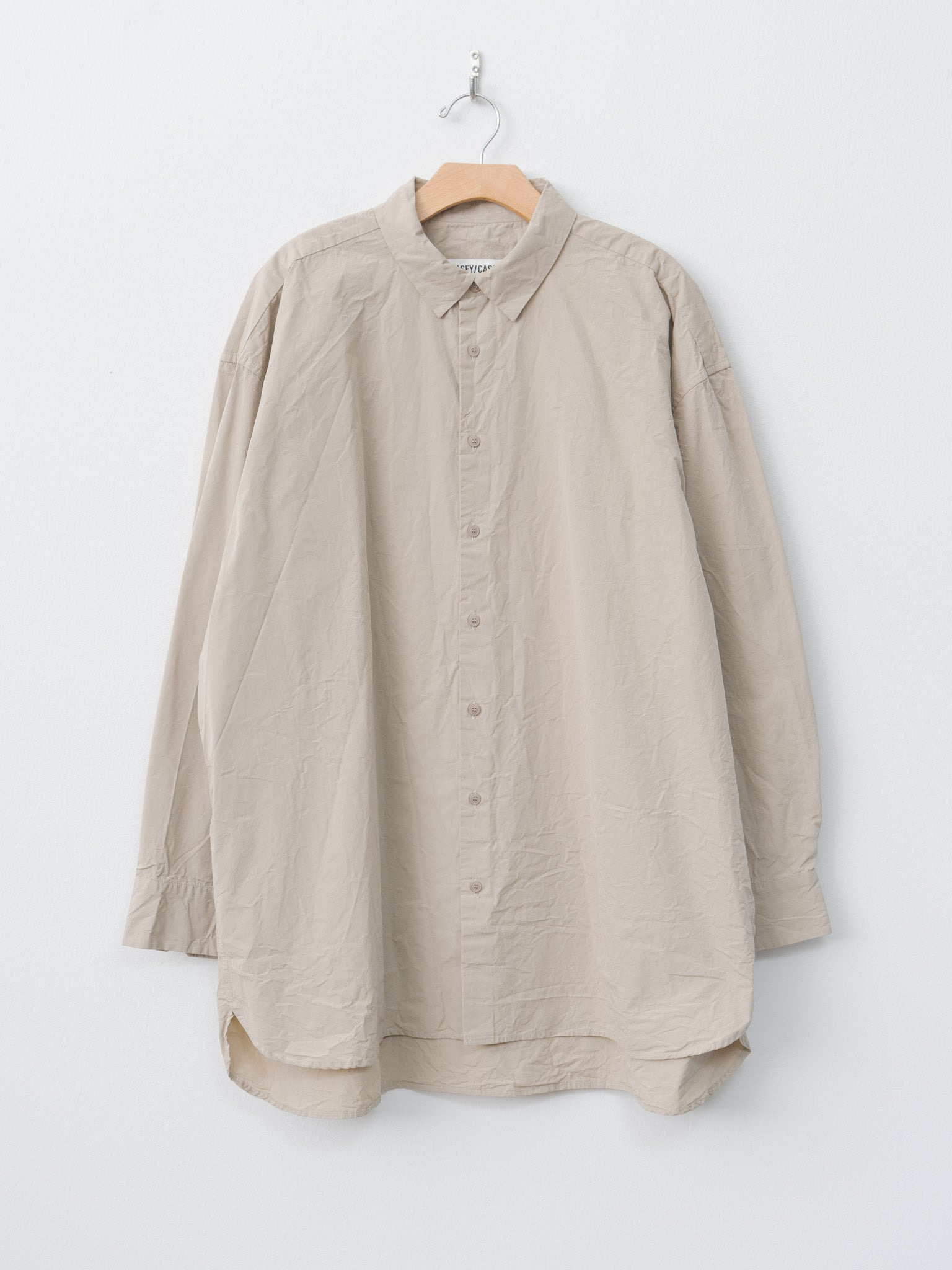The Hamnet is an oversized shirt from Casey Casey made with a smooth, lightweight paper cotton with a washed finish. It features an effortless drape with a sweeping curved hem with an extended back, dropped shoulders, buttoned cuffs, a regular collar and tonal corozo buttons. - Made in France - 100% Cotton - Available in Beige, Blu Skull (gray) - The model is 6'1"/185cm and wears size M - We recommend sizing down for a more regular fit