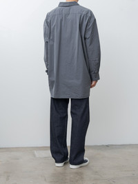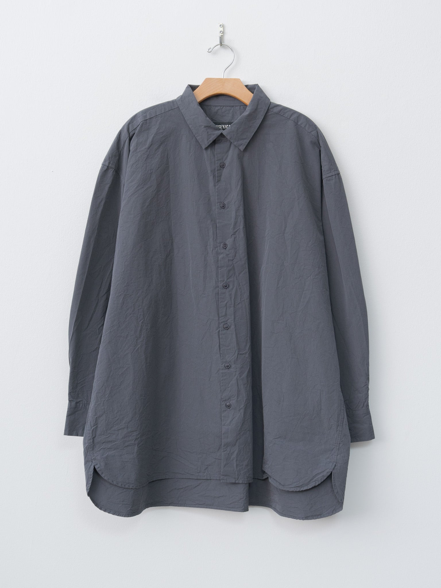 The Hamnet is an oversized shirt from Casey Casey made with a smooth, lightweight paper cotton with a washed finish. It features an effortless drape with a sweeping curved hem with an extended back, dropped shoulders, buttoned cuffs, a regular collar and tonal corozo buttons. - Made in France - 100% Cotton - Available in Beige, Blu Skull (gray) - The model is 6'1"/185cm and wears size M - We recommend sizing down for a more regular fit