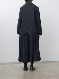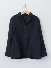 The Val Jacket is a three-button tailored style featuring a notched lapel and a softly structured silhouette. Crafted from lightweight Fosca virgin wool gauze, it offers warmth and comfort without added weight. Details include front patch pockets with button closures, corozo button front, curved front hem, back vent, and wool lining. - Made in France - 100% Virgin Wool, Lining: 100% Virgin Wool - Available in Blue (navy) - Coordinating item with Up Up Skirt FOSCA - The model is 5'7"/170 cm and wears size S