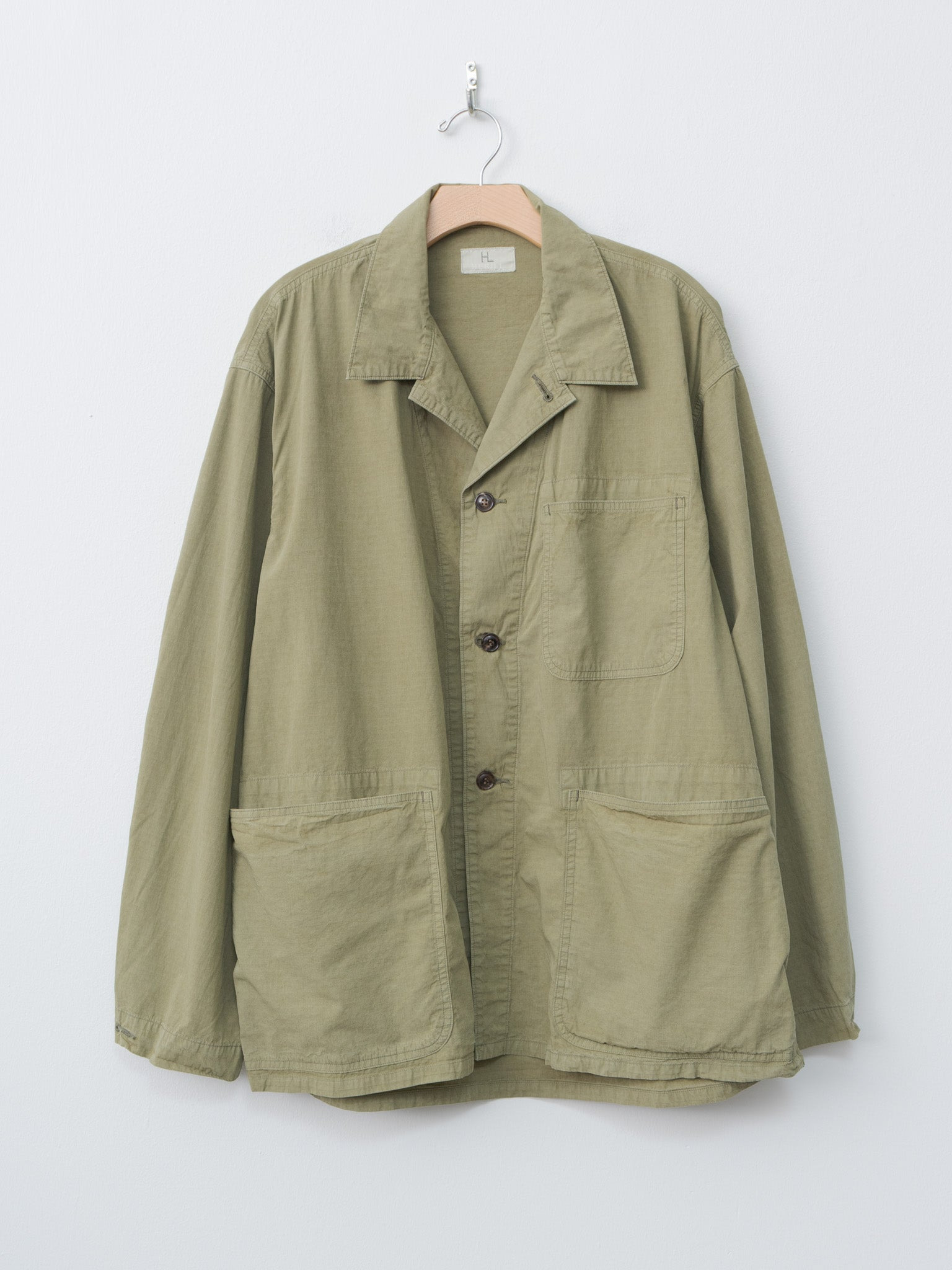 Lightweight chore-style jacket crafted from a crisp, slightly textured cotton in a muted olive green. Designed with a relaxed fit, it features a notched collar, three patch pockets on the front, and buttoned cuffs. The fabric has a soft, lived-in feel with subtle puckering at the seams, emphasizing the garment’s utilitarian character and vintage inspiration. - Made in Japan - 100% Cotton - Available in Olive Drab, Black - The model is 6'1"/185 cm and wears size 3/L
