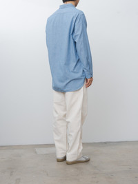 A US Navy inspired shirt featuring buttoned patch pockets on the front. The fabric is a lightweight and breathable cotton chambray. Other details include a regular collar, tonal buttons, a curved hem with a longer length in the back. Relaxed fit. - Made in Japan - 100% Cotton - Available in Indigo - The model is 6'1"/185 cm and wears size 3/L
