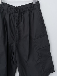Wide fit cargo shorts from Kaptain Sunshine crafted from a cotton poly blend. It is a smooth material that balances lightness, suppleness and structure. Details include a drawstring elastic waist, side pockets and large, functional wrap around cargo pockets. - Made in Japan - Available in Dull Olive and Black - Cotton 70%, Polyester 30% - The model is 6'1" / 185 cm and wears size 32
