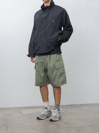 Wide fit cargo shorts from Kaptain Sunshine crafted from a cotton poly blend. It is a smooth material that balances lightness, suppleness and structure. Details include a drawstring elastic waist, side pockets and large, functional wrap around cargo pockets. - Made in Japan - Available in Dull Olive and Black - Cotton 70%, Polyester 30% - The model is 6'1" / 185 cm and wears size 32