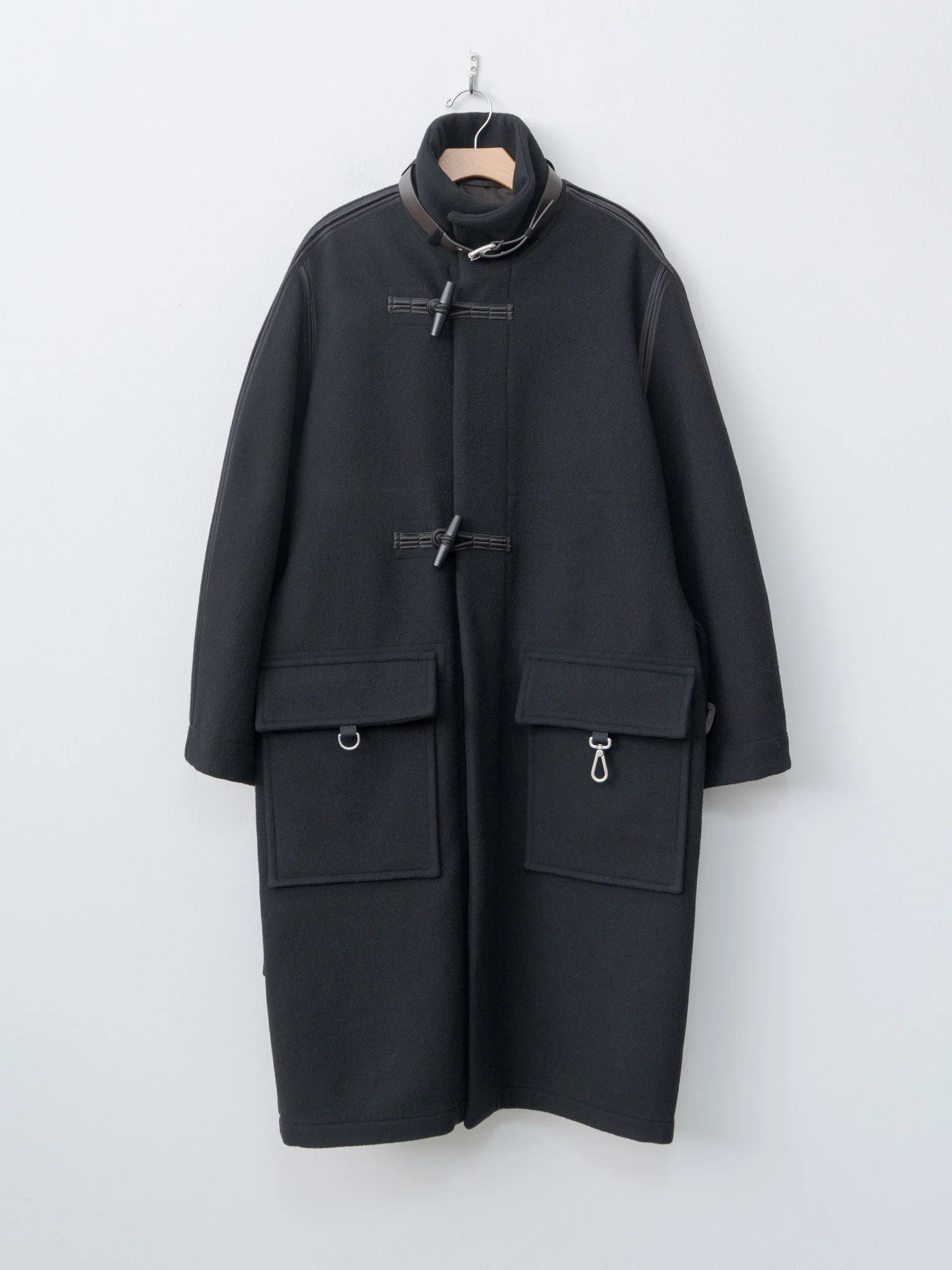 The Duffle Coat is an oversized outerwear style crafted from double-faced wool, offering a soft and insulating wear. It features shiny satin piping and utilitarian hardware for a refined, functional aesthetic. Details include a stand-up collar with snap closure, patch pockets with flaps, and a removable belt with a leather-wrapped metal buckle. - Made in Lithuania - 100% Wool - Available in Black - The model is 5'8"/173cm and wears size 36/S