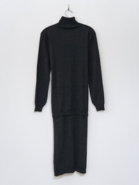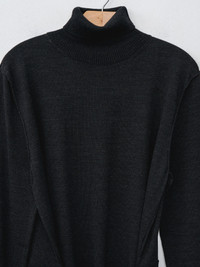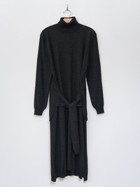 A beautiful merino blend dress with a dry hand feel and a slightly heathered appearance. This relaxed silhouette features a panel knitted at the waist, mimicking a sweater with sleeves to tie around the hip or to wear loose, in the same material as the dress. The ribbed high neck has a relaxed fit, and the seams at the armholes and the waist are reversible. The cuffs at the sleeves are also ribbed, borrowing and deconstructing the codes of a classic sweater. - 50% Wool, 50% Acrylic - Made in Portugal - Available in Anthracite (charcoal gray) and Hazelnut Brown. Model photos shown in Anthracite. - Our model is 5'7/170cm and wears size S