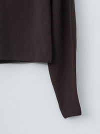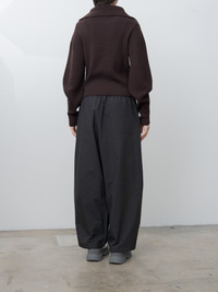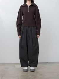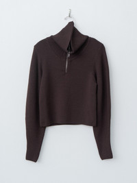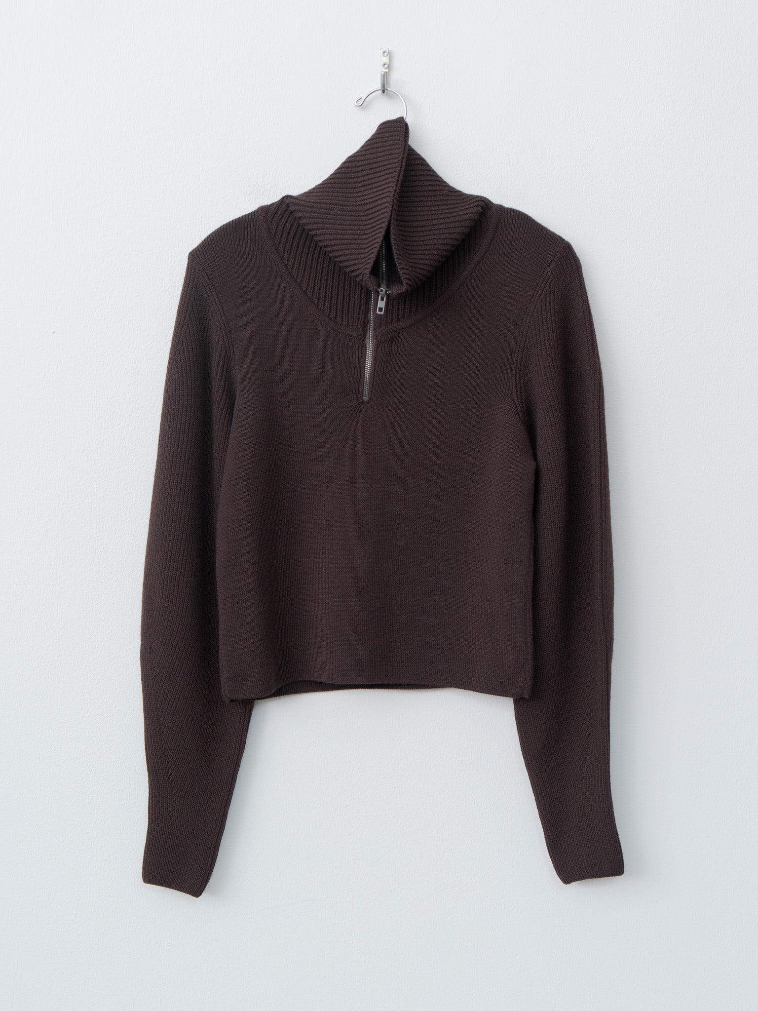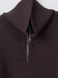 A half zip sweater knitted in combed worsted wool, a durable midweight knit with a soft, luxurious feel. Details include a ribbed half-zip collar that can be folded down, ribbed voluminous sleeves, and varied knit structures between the collar, sleeves, and body that create shape and texture. Slightly cropped fit. - Made in Portugal - 100% Wool - Available in Black and Aubergine - The model is 5'8"/173cm and wears size S