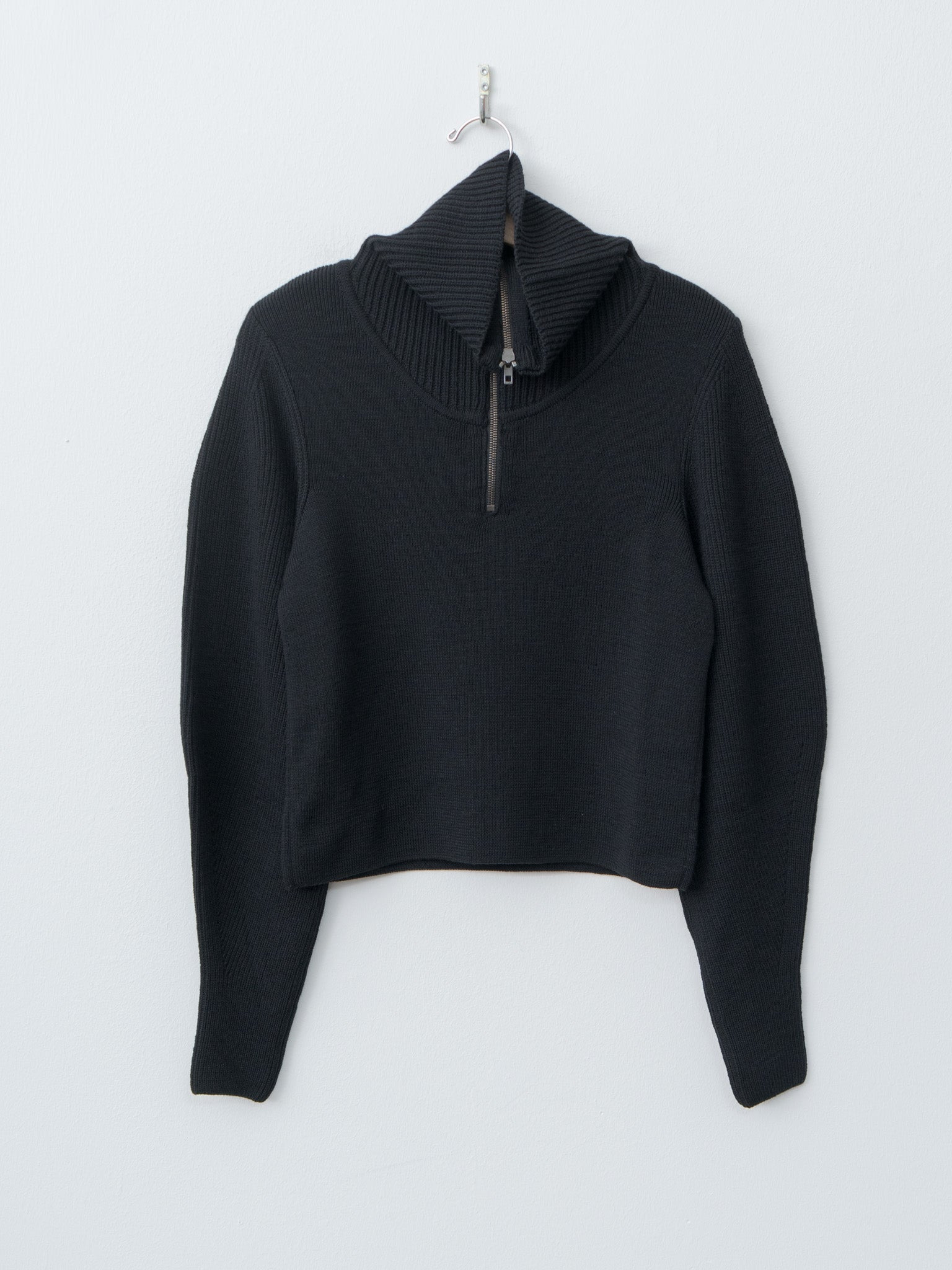 A half zip sweater knitted in combed worsted wool, a durable midweight knit with a soft, luxurious feel. Details include a ribbed half-zip collar that can be folded down, ribbed voluminous sleeves, and varied knit structures between the collar, sleeves, and body that create shape and texture. Slightly cropped fit. - Made in Portugal - 100% Wool - Available in Black and Aubergine - The model is 5'8"/173cm and wears size S