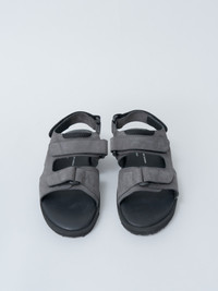 The 1837NL British Military Sandal is based on sandals used by the British military through the 2000s, reissued in collaboration with the original factory. The upper is made from fine Italian nubuck leather, paired with a full-grain leather footbed treated for antibacterial and antiviral protection. A cowhide leather lining improves comfort, while the EVA midsole and rubber outsole provide cushioning and grip. - Made in Slovakia - Leather - Available in Dark Gray Nubuck - EU sizing - true to size. If in between sizes, we recommend sizing up. - For larger sizes, please check here