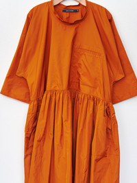 We are so excited about the Delos dress from Sofie D'Hoore. At first glance, the poly taffeta may seem reserved for special occasions, but in true Sofie fashion, she makes taffeta work for everyday wear. This easy drop waist dress features a rounded, slightly raised neckline, dropped shoulders, roomy 3/4 sleeves that can be rolled up, a chest pocket, and side pockets. The poly taffeta is smooth and lightweight with an elegant sheen. - Made in Bulgaria - 100% Polyester - Available in Curcuma (orange), Touareg (blue navy), and Olive Oil (green) - Model is 5'7/170cm and wears size 34/XS