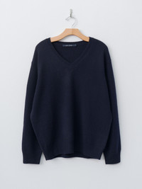 The Mann Sweater is an oversized V-neck style crafted from soft and plush 3-ply cashmere. It features dropped shoulders and ribbed detailing at the neckline, cuffs, and hem. It is designed to be worn long and loose or styled with the hem at the hips. - Made in Belgium - 100% Cashmere - Available in Midnight and Mid Grey Melange - The model is 5'7"/170 cm and wears size S
