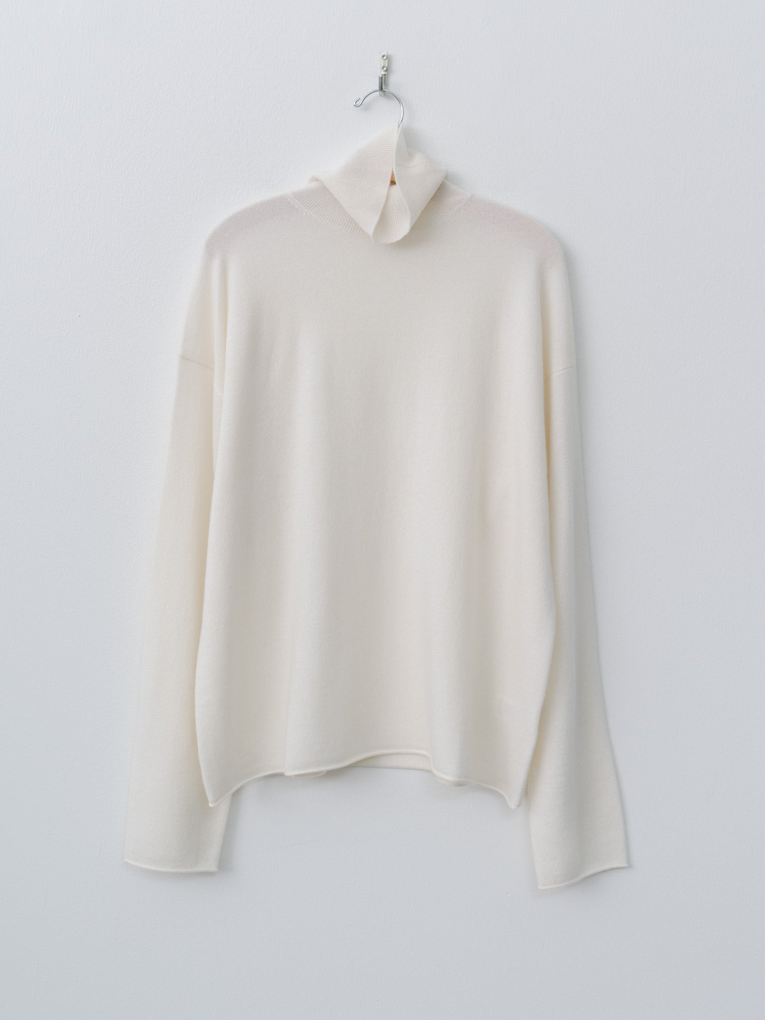 The Marchi Sweater is an oversized turtleneck crafted from ultra-soft, lightweight 1-ply cashmere. It features dropped shoulders, a longer hem and cuffs, and rolled edges at the cuffs and hem. It makes for a great layer - adding warmth without bulk. - Made in Belgium - 100% Cashmere - Available in Mid Grey Melange and Ivory - The model is 5'7"/170 cm and wears size S