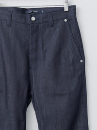 The Padova Denim Trouser is a regular-fit, straight-leg style crafted from midweight raw denim with a structured feel. It features front slash pockets, back patch pockets with rivet reinforcement, and a buttoned fly. - Made in Italy - 100% Cotton - Available in Raw Denim - The model is 5'7"/170 cm and wears size 34/XS - The waist runs large - we recommend sizing down