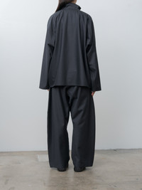 The Plof is Sofie's signature drop-crotch trouser, this time crafted in a Super 110s, lightweight suiting wool with a beautiful drape. Designed with an oversized fit, it features an elasticated waistband with inner drawstrings, side pockets, a back welt pocket, and a relaxed silhouette through the hips and legs. - Made in the EU - 100% Wool 100s - Available in Charcoal Melange, Admiral - The model is 5'8"/173cm and wears size 36/S