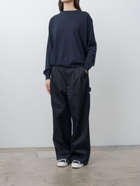 The Polke Trouser is a double-pleated, wide-leg style crafted from lightweight cotton gabardine with a slight sheen and a structured feel. Inspired by classic workwear, they feature a hammer loop detail on one leg, slanted side pockets, and back patch pockets. These are designed to sit lower on the waist with a loose, slouchy fit and a full-length inseam. - Made in Romania - 100% Cotton - Available in Midnight - The model is 5'7"/170 cm and wears size 34/XS - The waist runs large - we recommend sizing down