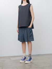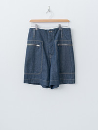 Wide leg denim shorts from Sofie D'Hoore made in a structured yet breathable cotton hemp blend. It features zip patch pockets that wrap around the front and sides, belt loops and a wide leg fit. - Made in Italy - 80% Cotton, 20% Hemp - Available in Blue - The model is 5'7" / 170 cm and wears size 34/XS - The waist runs large - we recommend sizing down