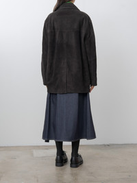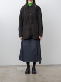 Ssstein's take on the car jacket crafted from soft cow suede pared down to 0.8mm, with a softly finished interior that enhances flexibility. It features a a clean, modern cut with minimal details and balanced construction. Details include full lining, buttoned front, dropped shoulders, patch pockets, side seam pockets and a back vent. - Made in Japan - 100% Cow Leather - Available in Dark Brown - The model is 5'8"/173cm and wears size XS - Unisex sizing - we recommend XS for XS/S, S for M/L