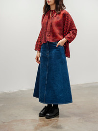 The Baringo skirt is crafted from 14 oz of denim with a structured drape. The high waist flows down into a flattering A-line silhouette - a look that can be dressed up or down. Further details include a button closure, zip fly, side seam pockets, square back patch pockets, and a midi length. Made in the United Kingdom 100% Cotton Available in Indigo Blue and White Model is 5'7 and wears size 0/S for a relaxed fit