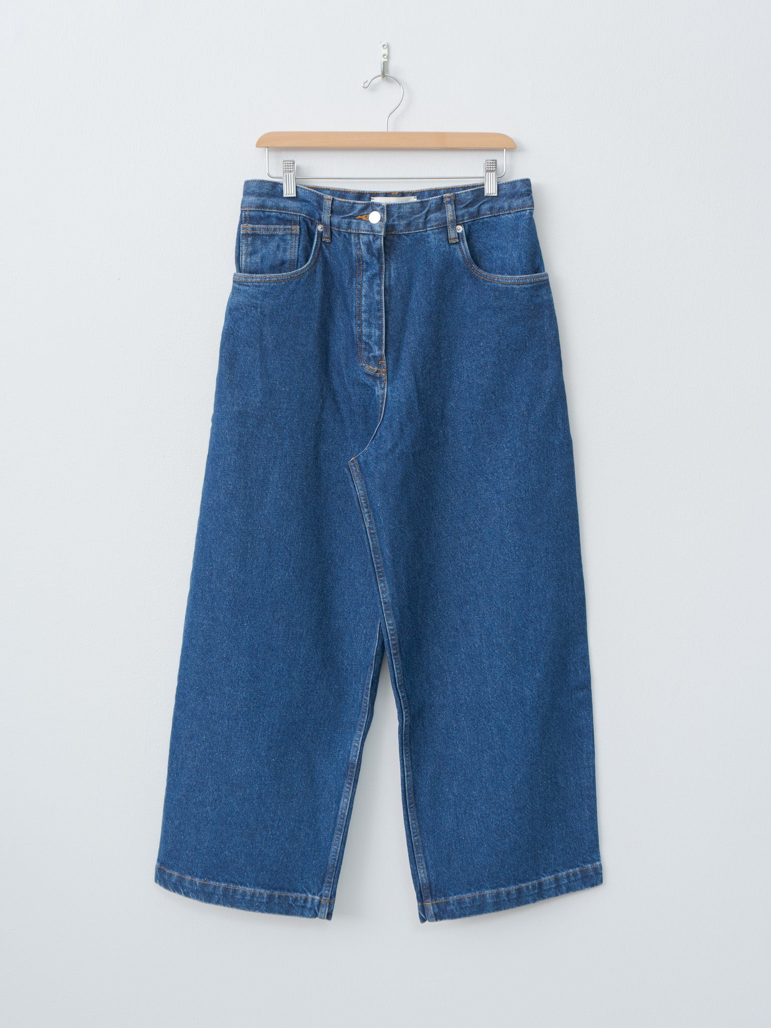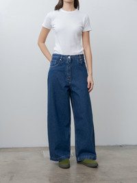 A wide-fit, skater-inspired jean from Studio Nicholson designed to sit lower on the hips. Crafted from 14oz Italian denim woven from organic cotton, it features classic details including metal rivets, tobacco stitching, five-pocket construction, and a button and zip fly. - Made in Turkey - 48% Cotton, 52% Regenerative Cotton - Available in Indigo Wash and Black - The model is 5'8"/173cm and wears size UK8/S - The waist runs large, we recommend sizing down one size