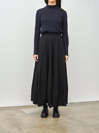 The Parachutist skirt has a beautiful shape resembling the volumes of a parachute, with the bottom hem tapering into create a subtle cocoon shape. It is made in a fine ripstop cotton that is durable and lightweight. Strips of contrast binding and tonal topstitching highlight the interesting cut lines. Clean waisted at the front, the back waist has elastic for added flexibility with a zip and button closure. Great for dressing up or down. - 100% Cotton - Made in EU - Available in Flint (black) - Our model is 5'7/170cm and wears size 1/S