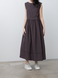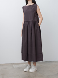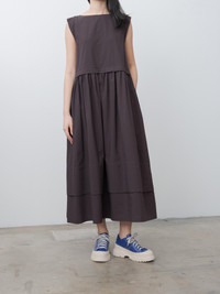 A light, easy thrown on midi length dress inspired by the Potter's apron. It features a high waistline, gently gathered tiered skirt, shallow scooped neckline and sharp architectural capped sleeves. The fine ripstop cotton feels lightweight and airy with a subtle texture. - Made in Portugal - 100% Cotton - Available in Fine Ripstop Cotton Jam (red) and Coffee (brown) - The model is 5'7" (170 cm) and wears size S