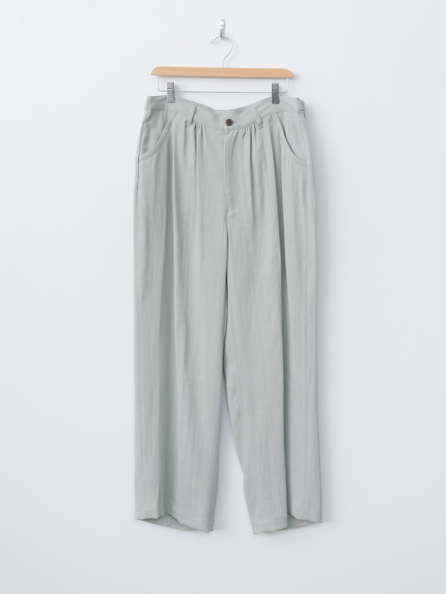 These wide trousers are constructed from a luxurious linen/acetate twill that balances fluid drape with crisp structure. It has a silk-like luster and natural wrinkles characteristic of fine linen. Details include front gathers, crease stitching, side tab adjusters at the waist, side pockets and back welt pockets. The silhouette is cut wide through the leg for a relaxed, flowing fit. - Made in Japan - 64% Linen / 36% Acetate - Available in Mist Green, Black - The model is 6'1"/185 cm and wears size 4/L