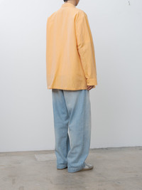 A photographer jacket featuring 8 pockets on the front for great storage capacity.The slubby linen weft gives the fabric a crisp, dry hand and visible texture, while the acetate warp adds subtle sheen and excellent moisture absorption - it is finished with a washer process to give it a natural look and feel. Details include a button and zip front, convertible stand collar, zip pockets, dual-opening patch pockets, buttoned cuffs, and a straight hem. Unlined. - Made in Japan - 48% Linen / 34% Acetate / 18% Cotton - Available in Deep Sunflower, Black - The model is 6'1"/185 cm and wears size 4/L