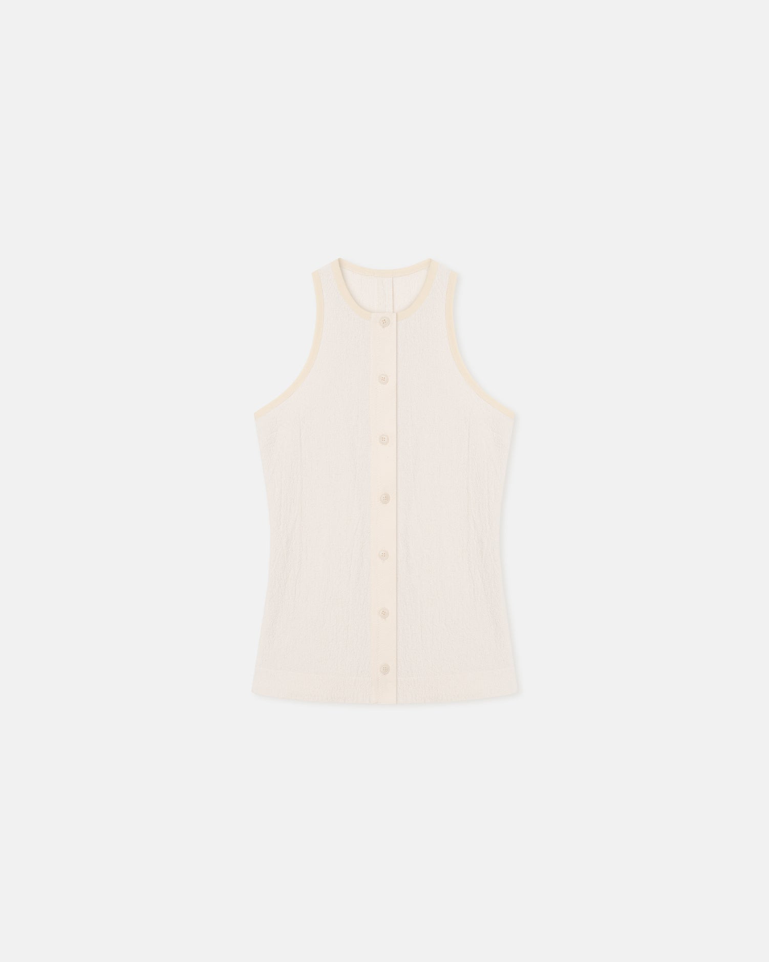 The Arne top is an elevated take on the tank top. Crafted from lightly textured crepe melange, it has a sense of refinement thanks to the button-fastening placket. Fit Tailored to be fitting against the body. Materials and Care Shell: 60% Cotton 27% Polyester 9% Polyamide 4% Elastane Trimmings: 100% Wool Detail: 100% Wool Hand wash cold, do not bleach, do not tumble dry, iron low heat (110°), dry clean any solvent except trichloroethylene, do not wring Handle with care and wash less to ensure garment lifespan. Repair or resell to support circular fashion.