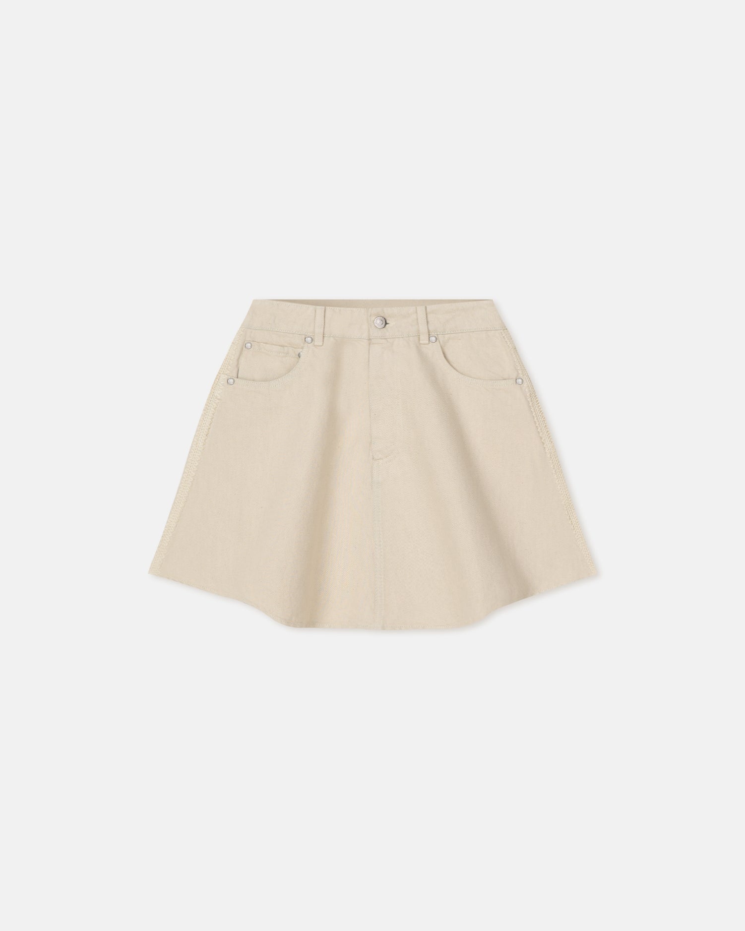 Volume is a key design principle this season. The Neah mini skirt is made from beige denim with a fluted hem outlined by crochet trims. Belt loops and a 6-pocket design keep things classic. Fit Intentionally designed for an oversized look. Materials and Care Shell: 100% Cotton Lining: 100% Cotton Hand wash, do not bleach, do not tumble dry, iron low heat (110°), gentle dry clean any solvent except trichloroethylene Handle with care and wash less to ensure garment lifespan. Repair or resell to support circular fashion.