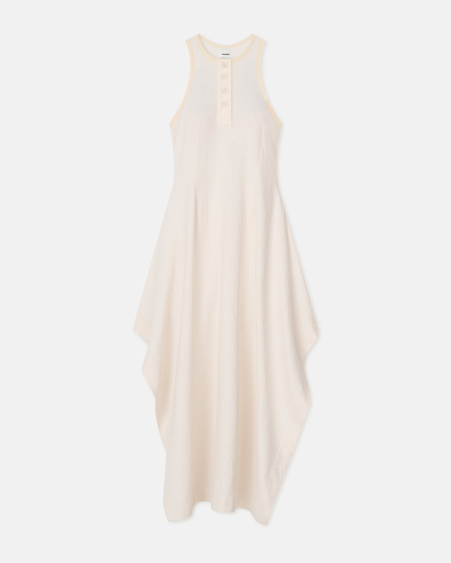 Fluid sculptural hemlines are a key part of our Pre-Fall 2025 collection, evoking the shapes of nature. Made from lightweight crepe melange, the Thoosa dress fits close through the body before falling in a draped scarf hem. Fit Standard fit, matches usual sizing. Materials and Care Shell: 60% Cotton 27% Polyester 9% Polyamide 4% Elastane Trimmings: 100% Wool Detail: 100% Wool Hand wash cold, do not bleach, do not tumble dry, iron low heat (110°), dry clean any solvent except trichloroethylene, do not wring Handle with care and wash less to ensure garment lifespan. Repair or resell to support circular fashion.