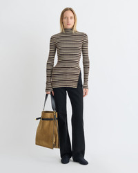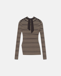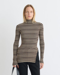 Nanushka’s Arella Top redefines modern layering and quiet sophistication. Crafted from a fine merino rib this turtleneck has a close to the body fit with a delicate back neck tie. In a black, brown, and green stripe the Arella Top balances structured elegance with comfort for everyday wear. Fit Tailored to be fitting against the body. Model is 175 cm (5'9'') and wears a size S. Materials and Care Shell: 95% WOOL, 4% NYLON, 1% SPANDEX Hand wash cold, Do not bleach, Do not tumble dry, Iron low heat (110°), Dry clean any solvent except trichloroethylene, Dry flat