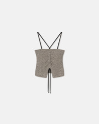 The Soraia top is made from cotton consisting of looped black and creme threads – a new fabric technique to celebrate our 20th anniversary as a brand. It has a flattering ruched front that you can exaggerate with the strings. Fit Tailored to be fitting against the body. Materials and Care Shell: 100% Cotton Do not wash, do not bleach, do not tumble dry, iron low heat (110°), dry clean any solvent except trichloroethylene, do not wring. Handle with care to ensure garment lifespan. Repair or resell to support circular fashion.