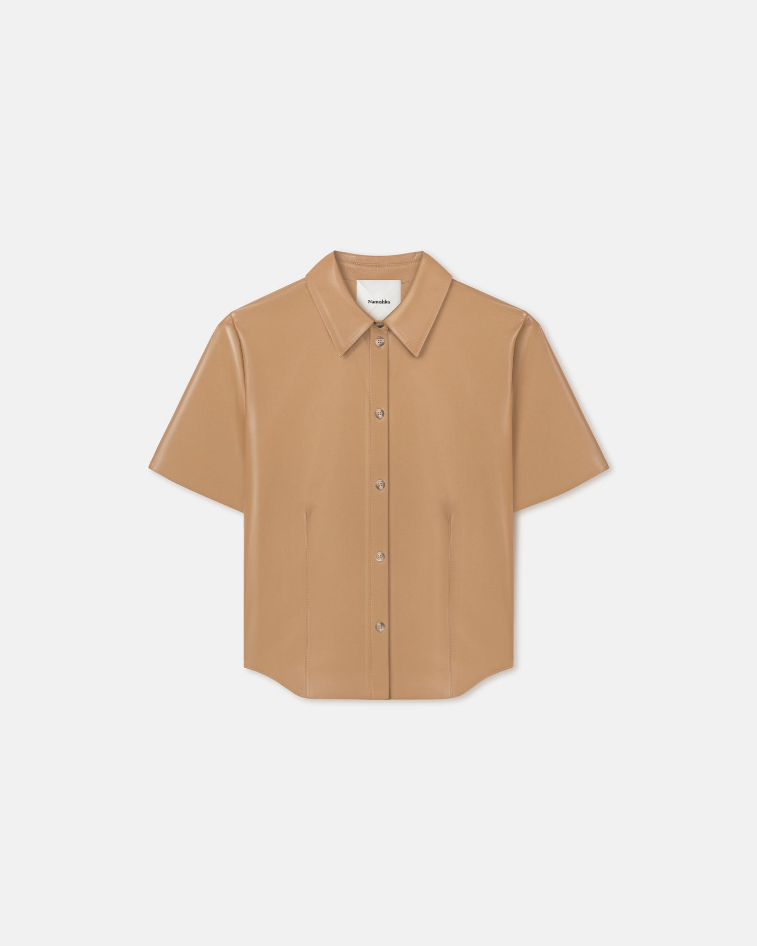 The Clare shirt exemplifies understated elegance. It’s made from our signature Okobor™ in a rich oak tone for a slim-fitting, short-sleeved silhouette. Fit Standard fit, matches usual sizing. Materials and Care Shell: Shell1: 100% Polyester (Recycled), Shell2: 100% Polyurethane Do not wash, do not bleach, do not tumble dry, do not iron, gentle dry clean any solvent except trichloroethylene Handle with care to ensure garment lifespan. Repair or resell to support circular fashion. This product is made from a delicate fabric and has a special finish, The dark colour of this product may transfer onto light surfaces and cause damage. Please store separately and handle with care.