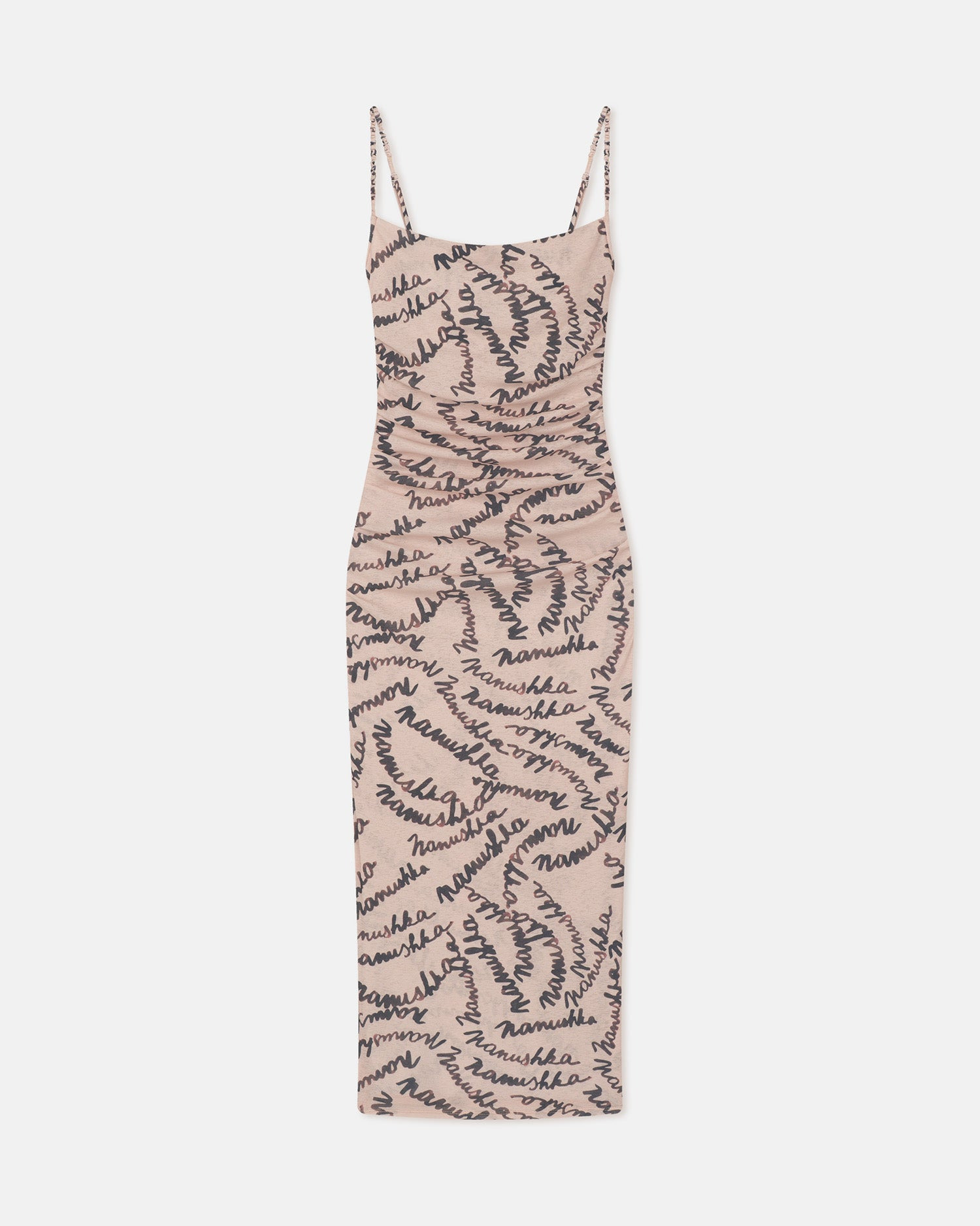 The Adie dress is part of our RECRAFTED collection, transforming surplus materials into new, elevated pieces. Made from deadstock recycled mesh jersey, it hangs from thin spaghetti straps and ruches around the body beautifully. It’s decorated with our Scribble Logo print in creme. Materials and Care Shell: 100% Recycled Polyester Machine wash warm (30°) permanent press, do not bleach, do not tumble dry, iron low heat (110°), do not dry clean, do not wring Handle with care and wash less to ensure garment lifespan. Repair or resell to support circular fashion.