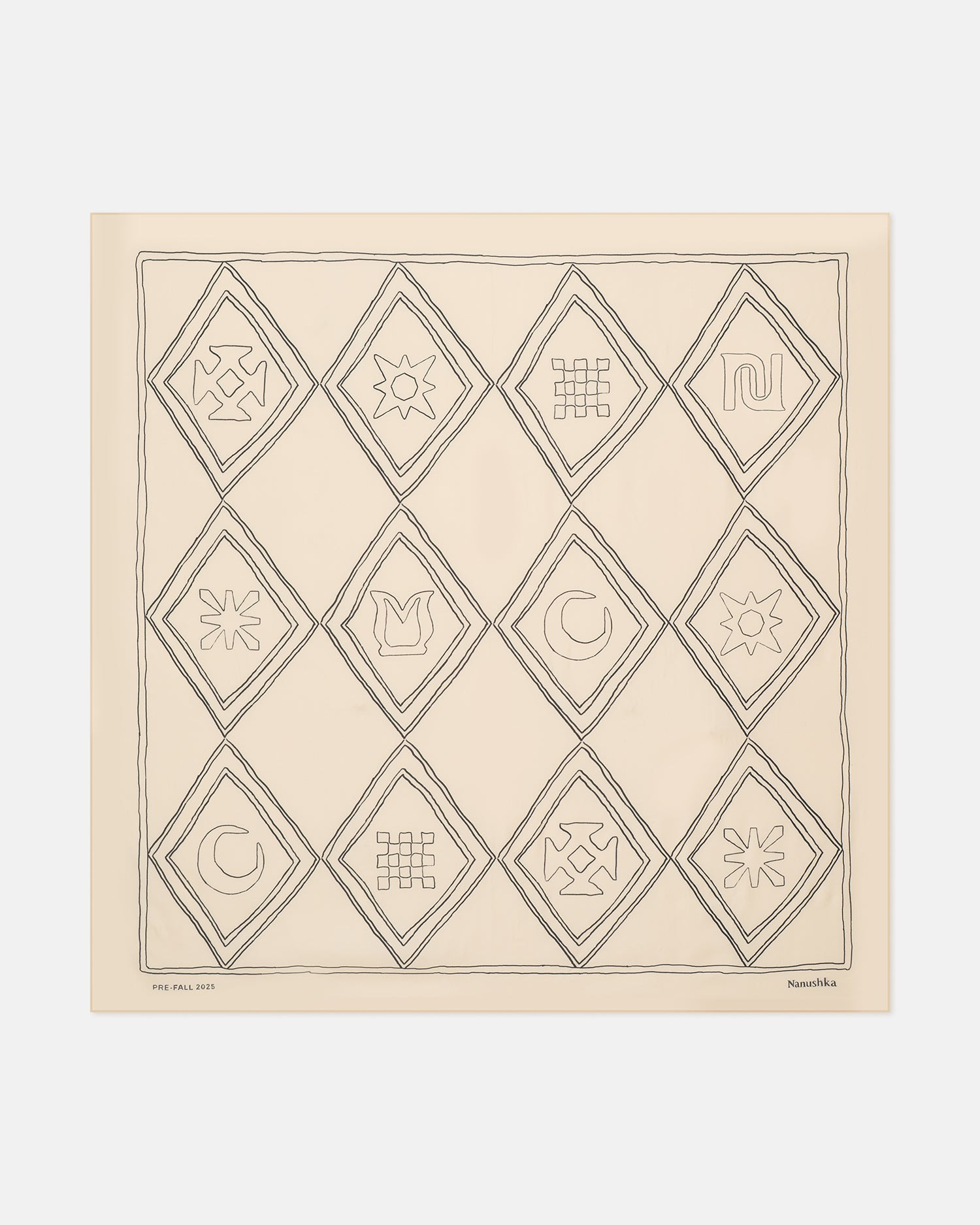 The Miani scarf is decorated with a Symbol Argyle print, an array of motifs inspired by traditional Hungarian kopjafa motifs. Made from silk, it can be styled endlessly, from around the neck and shoulders to looped round the handle of a tote. Dimensions: 127x127 (cm) Materials and Care Shell: 100% Silk Do not wash, do not bleach, do not tumble dry, do not iron, do not dry clean Handle with care to ensure garment lifespan. Repair or resell to support circular fashion.