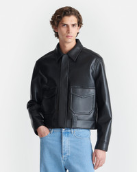 The Ruben jacket is made to endure. Crafted from hard-wearing regenerated leather in a classic black tone, it is minimally detailed to evoke classic flight styles – a cropped cut, capacious flap pockets, and button fastenings. Materials and Care Shell: Base: 100% Polyester Coating: 100% Polyurethane Back: Bonded Leather Middle: 80% Polyester 20% Nylon Do not wash, do not bleach, do not tumble dry, do not iron, dry clean any solvent except trichloroethylene, do not wring. Handle with care to ensure garment lifespan. Repair or resell to support circular fashion.